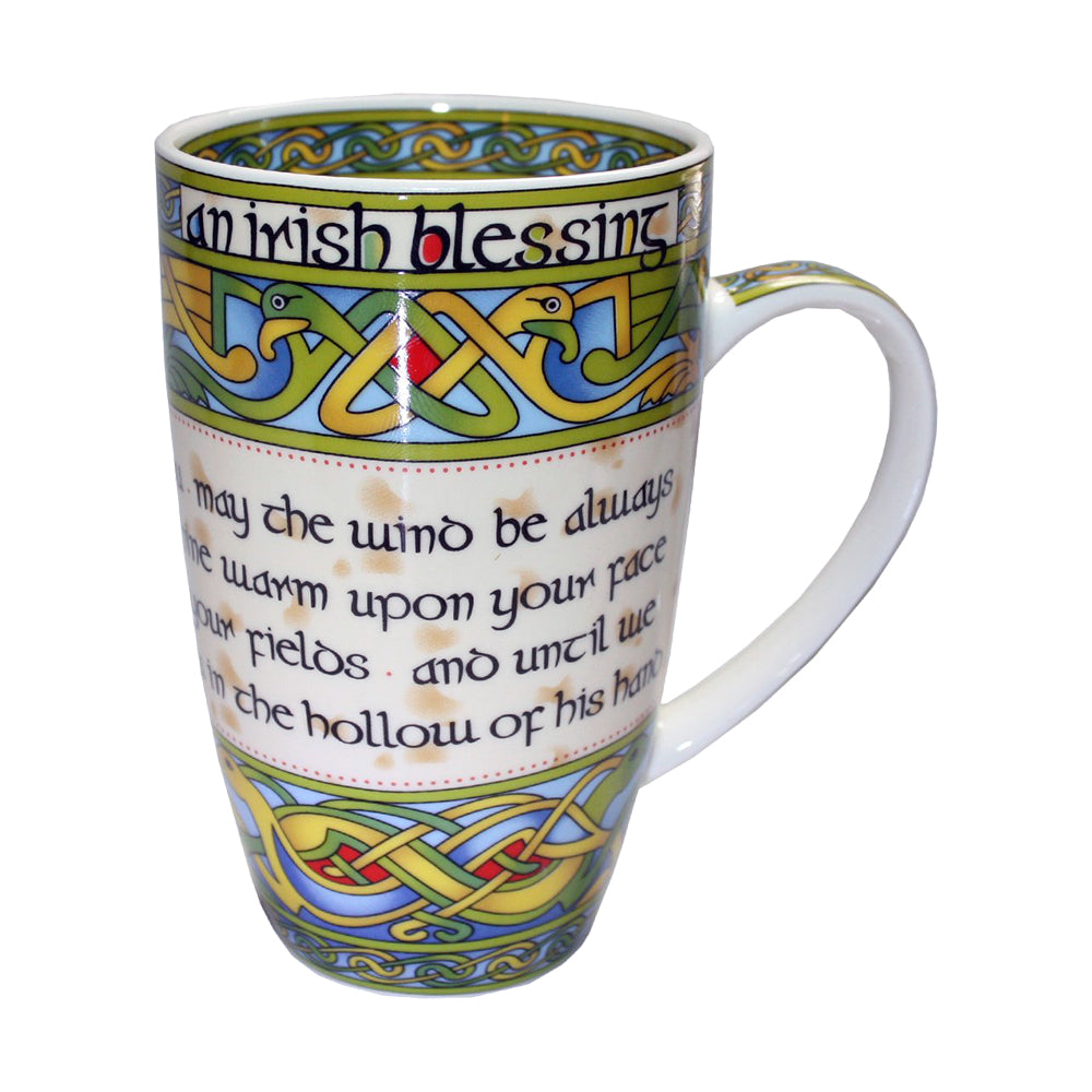 Any beverage tastes better out of this Irish Blessing mug that holds 14 fluid ounces of liquid. Start the morning with a mug of coffee or tea from this traditional Irish Blessing mug and invigorate your spirit to embrace the day. The Celtic design features multi-colored knotwork and a distinctive script that is inspired by 9th-century ancient Celtic manuscripts which were originally painted by monks onto vellum or calfskin.